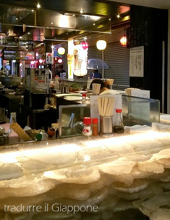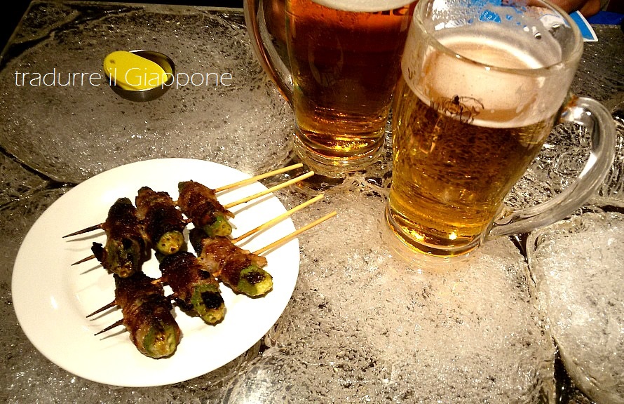 Quando usciamo dal locale, il tempo se vogliamo è addirittura peggiorato, il vento è fortissimo, e ci rifugiamo nuovamente nella galleria Sunroad, la zona commerciale di prima, dove in una delle strette stradine laterali troviamo un localino niente male dove mangiare yakitori, accompagnati da una Yebisu ghiacciata.