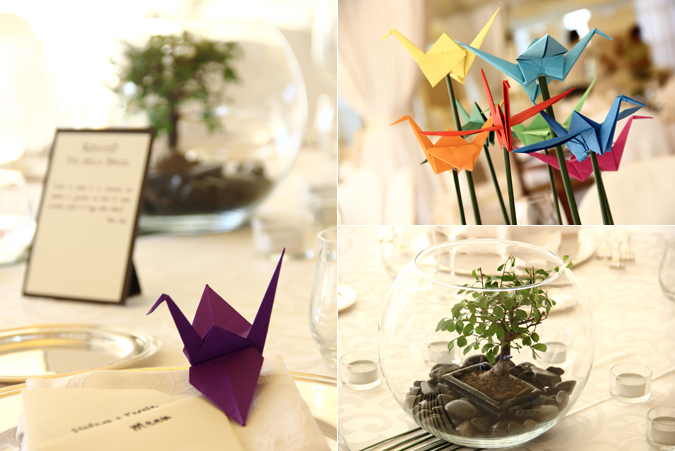 Per organizzare il tableau, potreste optare per il classico tabellone con immagini di ispirazione giapponese, oppure appendere i nomi dei tavoli e degli invitati sui rami di un albero, in alternativa potete usare le escort card, una delle tendenze di questi anni. Invece del classico tabellone, ogni invitato potrà prendere un oggetto o un biglietto che gli indicherà il tavolo dove sedersi, noi abbiamo scelto quest’ultima soluzione, ogni invitato ha ricevuto come escort card una gru di origami con sopra il suo nome (scritto anche in katakana) e il nome e il disegno del tavolo sui cui accomodarsi. Un’idea che è stata decisamente apprezzata (e a costo quasi zero).