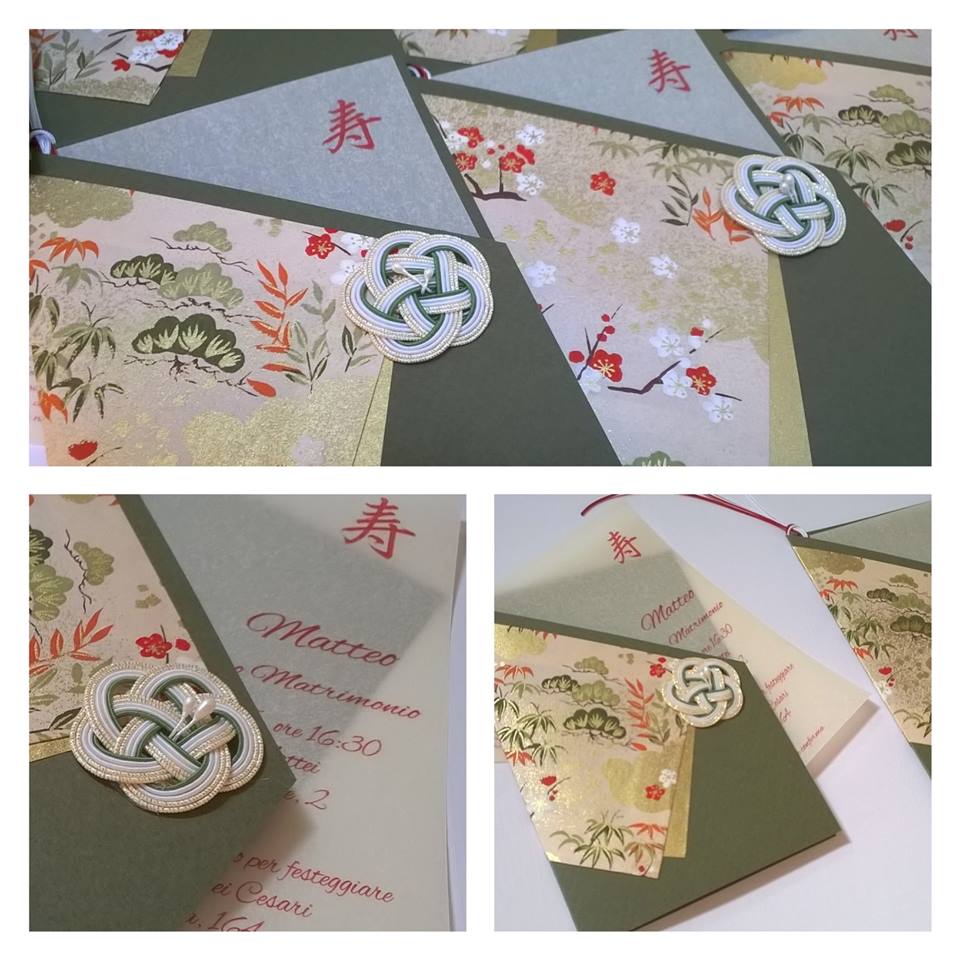Cominciamo dall’inizio, il vero biglietto da visita del vostro matrimonio è dato dalla Partecipazione. Lo so, per molti è un’idea piuttosto superata, ci sono le email, c’è whatsapp, e chi riceverà il vostro invito già saprà vita morte e miracoli delle vostre imminenti nozze, ma per me che sono un’amante della carta, questo aspetto non poteva proprio mancare, ed era indispensabile che rendesse da subito chiaro il tema che ispirava il matrimonio. Io mi sono rivolta a una bravissima artigiana giapponese che ha realizzato magnifiche partecipazione in carta washi, ma in alternativa (so che è stata subissata di lavoro, e se lo merita proprio!) potete optare per queste fantastiche partecipazioni origami che potete fare benissimo voi stessi (risparmiando non poco sul prezzo finale).