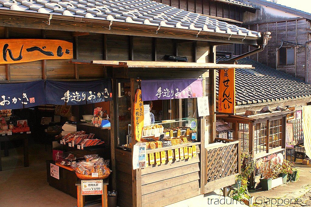 Troviamo subito il delizioso ryokan che ci ospiterà, una locanda storica di oltre 100 anni, in cui si respira un’atmosfera d’altri tempi. Magome è un villaggio delizioso, la sua strada lastricata, le botteghe di senbei e i negozietti tradizionali, le locande lungo la strada, tutta dà la sensazione di essersi fermato nel tempo. Sicuramente i diversi edifici della cittadina hanno subito diversi restauri (è molto tirata a lucido), tuttavia ciò non inficia, a mio parere, l’autenticità del luogo.
