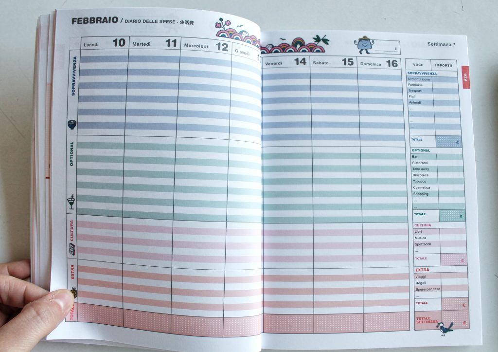Per ogni settimana del mese, in alto trovate una casellina “portafoglio” con il budget che avete ancora a disposizione, e una tabella in cui sommare le varie spese, molto utile per rendersi conto di dove sono andati a finire i nostri soldi, ed eventualmente aggiustare il tiro. Al vostro budget togliete il totale della settimana appena trascorsa, così da sapere per quelle successive quanti soldi ancora avete a disposizione.