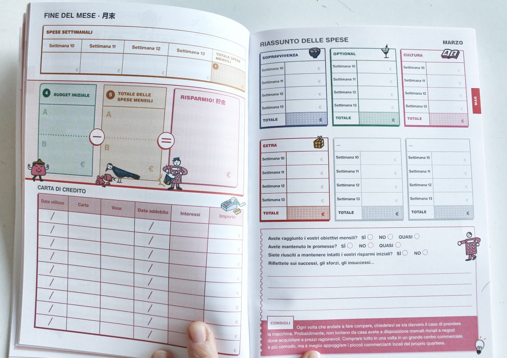 Trovate anche delle comode tabelle, in cui segnare il riassunto delle spese, quindi il totale del mese in sopravvivenza, optional, cultura ed extra. Questo vi permette di avere un piano di come spendete i vostri soldi, ed eventualmente correggere il tiro per i mesi successivi (a gennaio avete esagerato con i take away e bar in pausa pranzo? Per febbraio potreste iniziare a pensare a come organizzare diversamente i vostri pasti per risparmiare!).