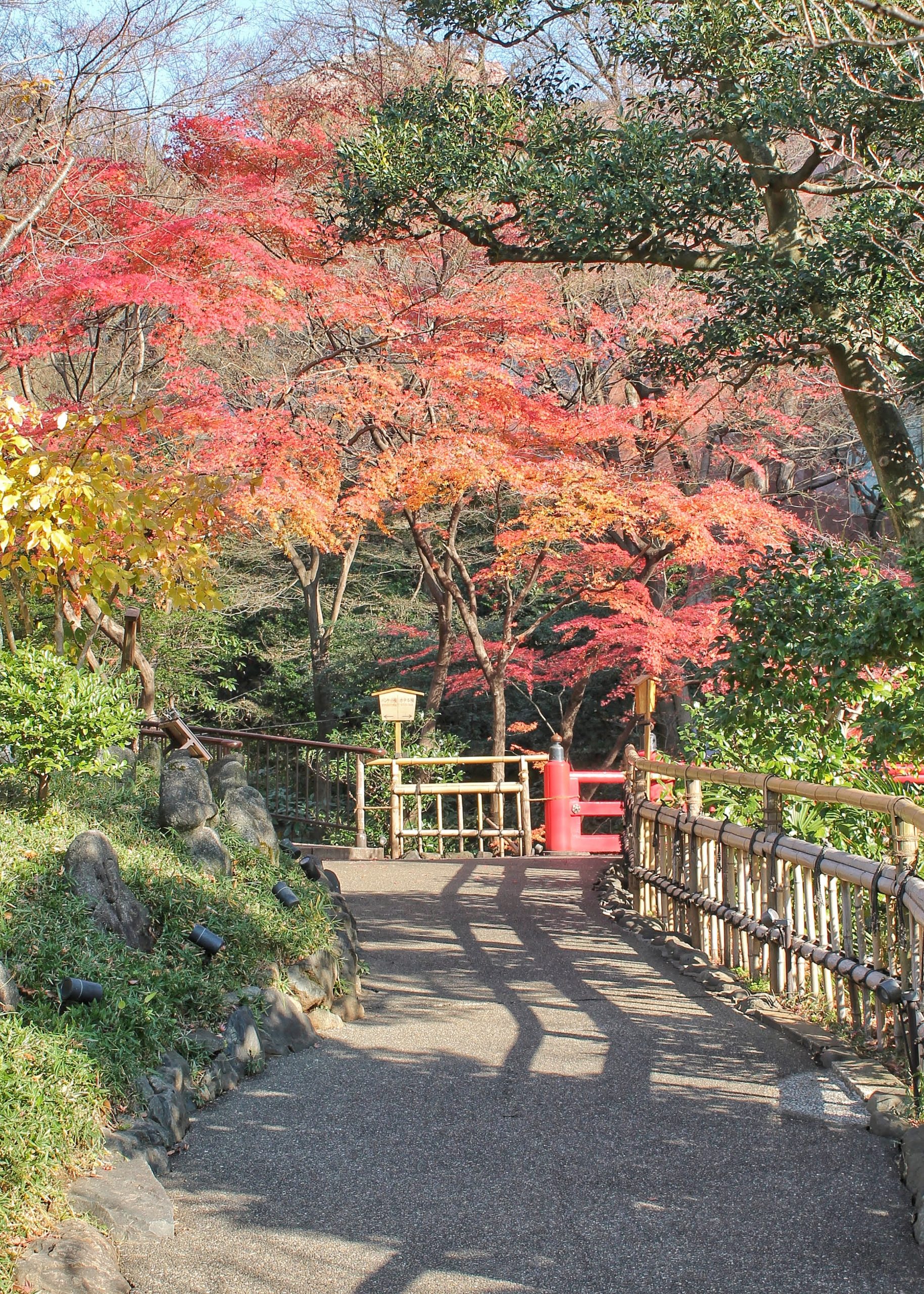 Il giardino si sviluppa lungo un lieve pendio, e appena si entra si dimentica completamente di essere nel cuore della città. Si attraversa un ponte rosso e ci si trova circondati dal verde degli alberi (alcuni momiji erano ancora tinti di rosso a dicembre).