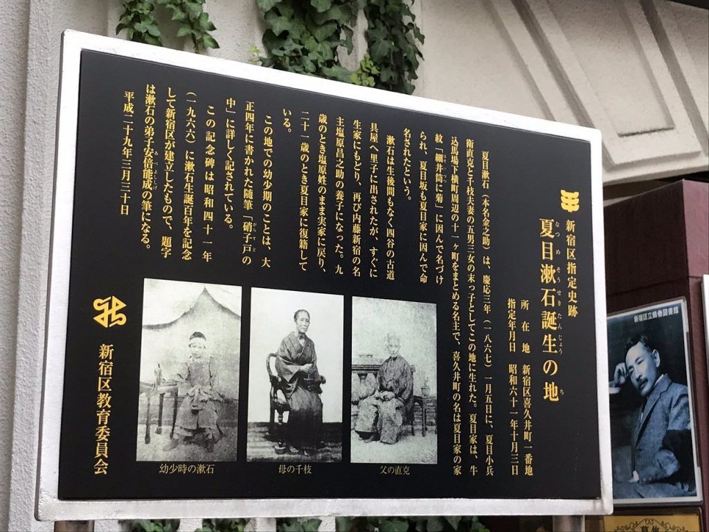 Natsume Sōseki (all’epoca Kinnosuke) nasce nel 1867 a Babashitachō, Ushigome (attuale Kikuichō, Shinjuku), a pochi passi dalla stazione Waseda. Ci si arriva dall’uscita ovest della metro, risalendo lungo la Natsumezaka-dōri, dall’incrocio con Waseda: oggi la casa non esiste più, ma nel 1967, è stato eretto un monumento in granito nero con incisa la dicitura “luogo di nascita di Natsume Sōseki”, per commemorare il 100 ° anniversario della sua nascita.